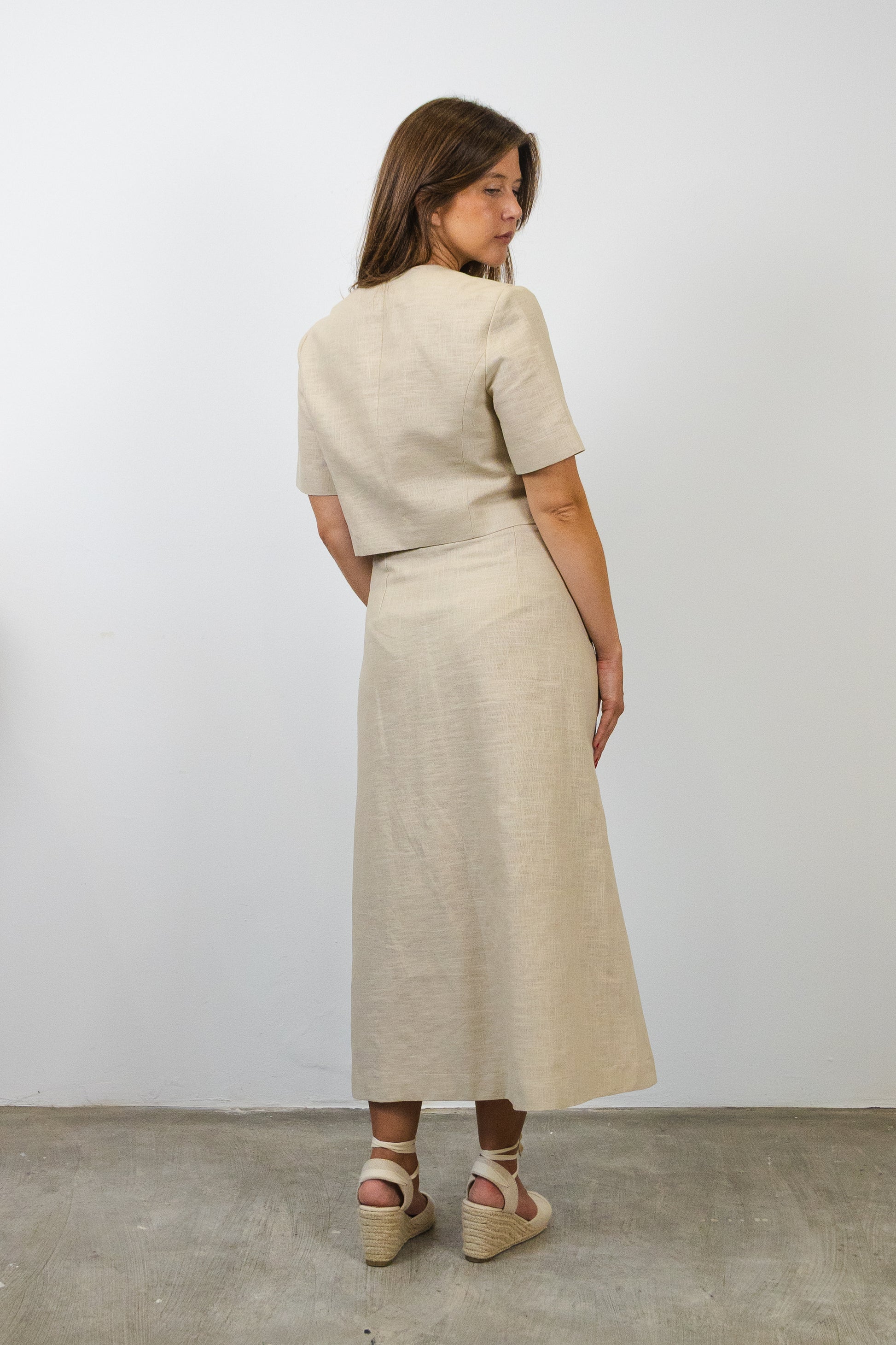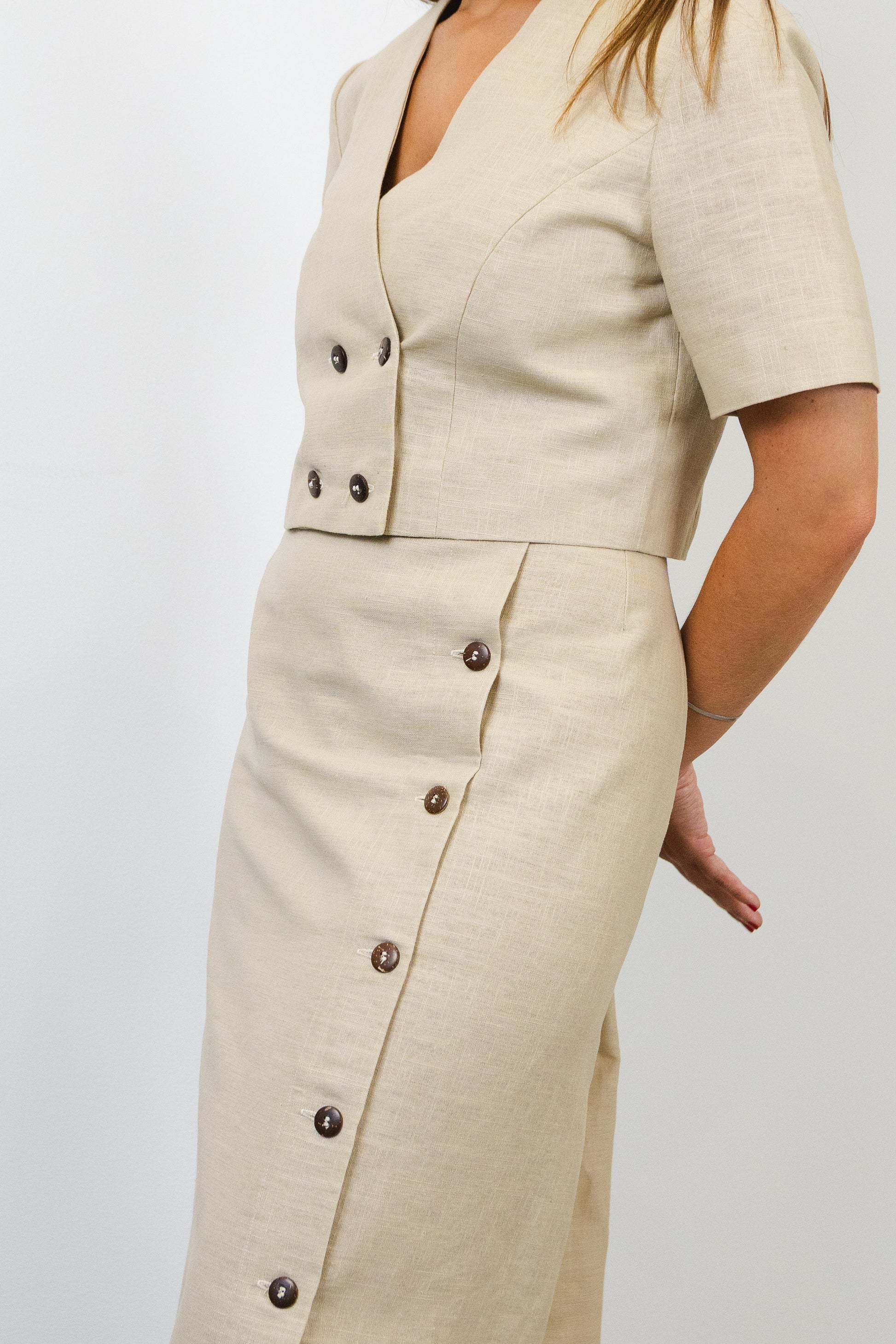 Short double-breasted jacket in raw linen, cupro lining, coconut shell buttons.